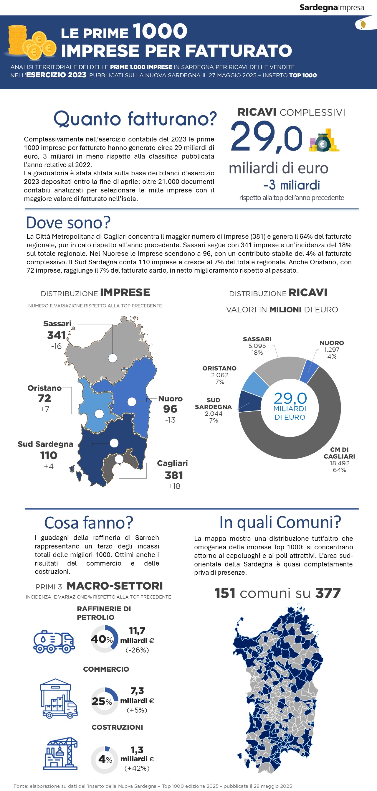 L’edizione 2025 della classifica “Top 1000” delle aziende sarde, relativa all’esercizio 2023, evidenzia un fatturato complessivo pari a circa 29 miliardi di euro, in diminuzione di 3 miliardi di euro rispetto alla rilevazione precedente. Il contributo della raffineria di Sarroch risulta particolarmente rilevante, generando da sola circa un terzo dei ricavi totali. Significativi anche i risultati dei settori del commercio e delle costruzioni.